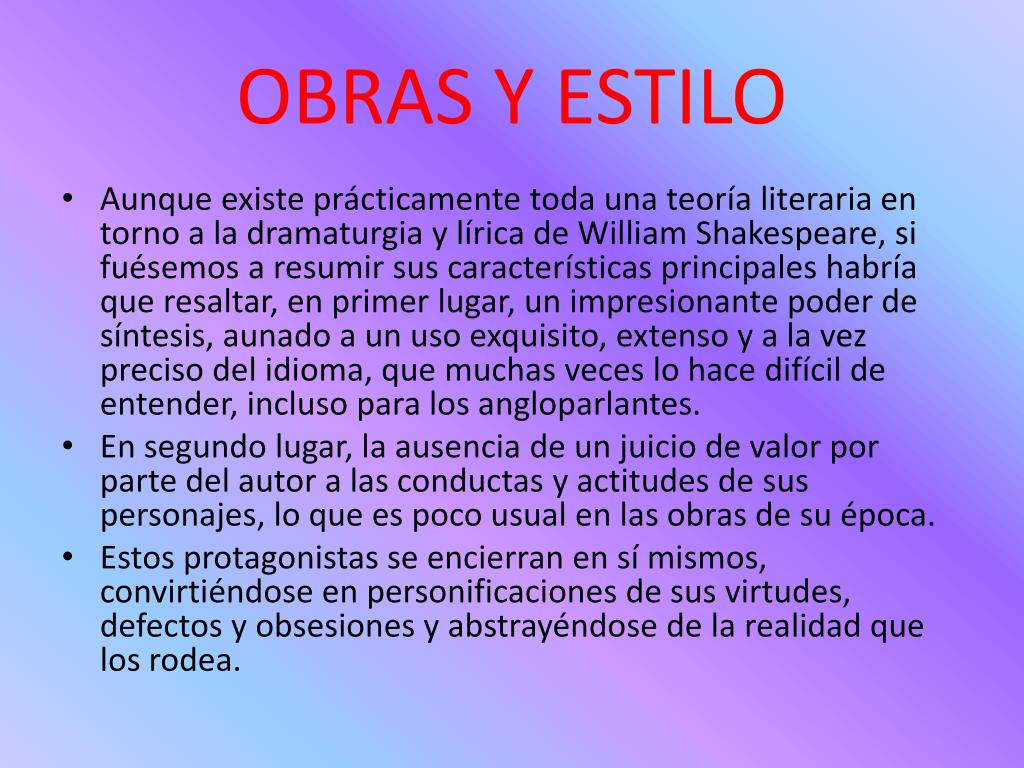 OBRAS Y ESTILO • Aunque existe prácticamente toda una teoría literaria en torno a la dramaturgia y lírica de William Shakespeare, si fuésemos a resumir sus características principales habría que resaltar, en primer lugar, un impresionante poder de síntesis, aunado a un uso exquisito, extenso y a la vez preciso del idioma, que muchas veces lo hace difícil de entender, incluso para los angloparlantes. • En segundo lugar, la ausencia de un juicio de valor por parte del autor a las conductas y actitudes de sus personajes, lo que es poco usual en las obras de su época. • Estos protagonistas se encierran en sí mismos, convirtiéndose en personificaciones de sus virtudes, defectos y obsesiones y abstrayéndose de la realidad que los rodea.