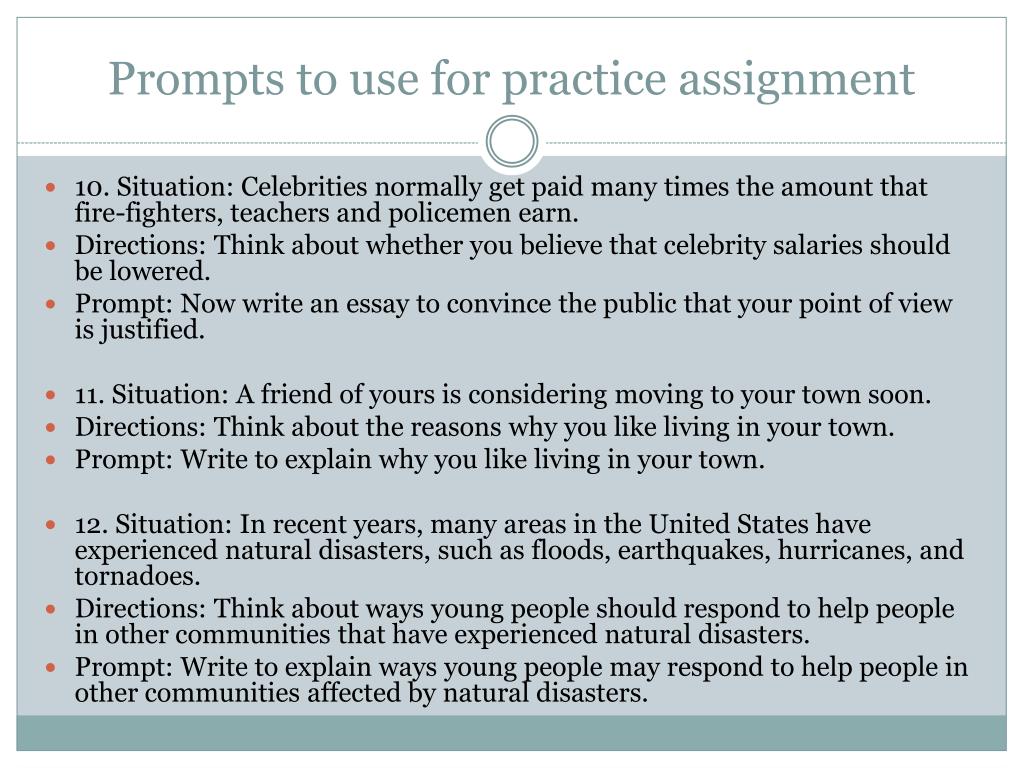 Prompts to use for practice assignment 10. Situation: Celebrities normally get paid many times the amount that fire-fighters, teachers and policemen earn. Directions: Think about whether you believe that celebrity salaries should be lowered. Prompt: Now write an essay to convince the public that your point of view is justified. 11. Situation: A friend of yours is considering moving to your town soon. Directions: Think about the reasons why you like living in your town. Prompt: Write to explain why you like living in your town. 12. Situation: In recent years, many areas in the United States have experienced natural disasters, such as floods, earthquakes, hurricanes, and tornadoes. Directions: Think about ways young people should respond to help people in other communities that have experienced natural disasters. Prompt: Write to explain ways young people may respond to help people in other communities affected by natural disasters.