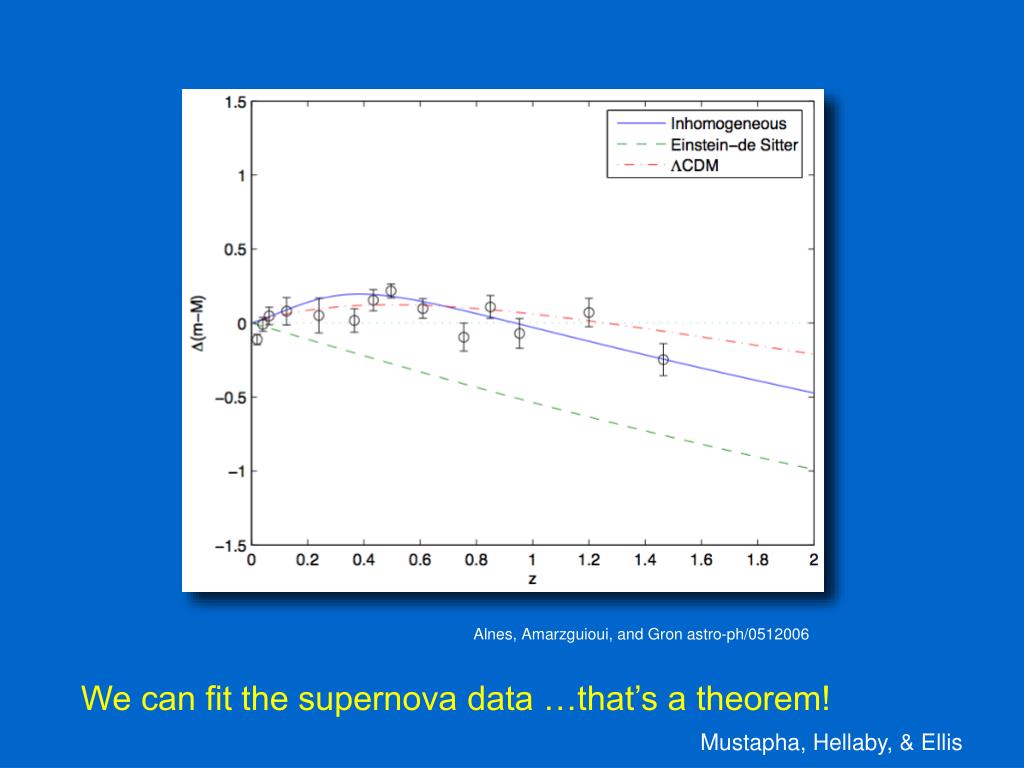 Alnes, Amarzguioui, and Gron astro-ph/0512006 We can fit the supernova data …that’s a theorem! Mustapha, Hellaby, & Ellis