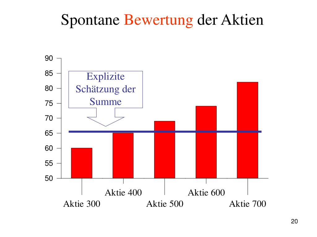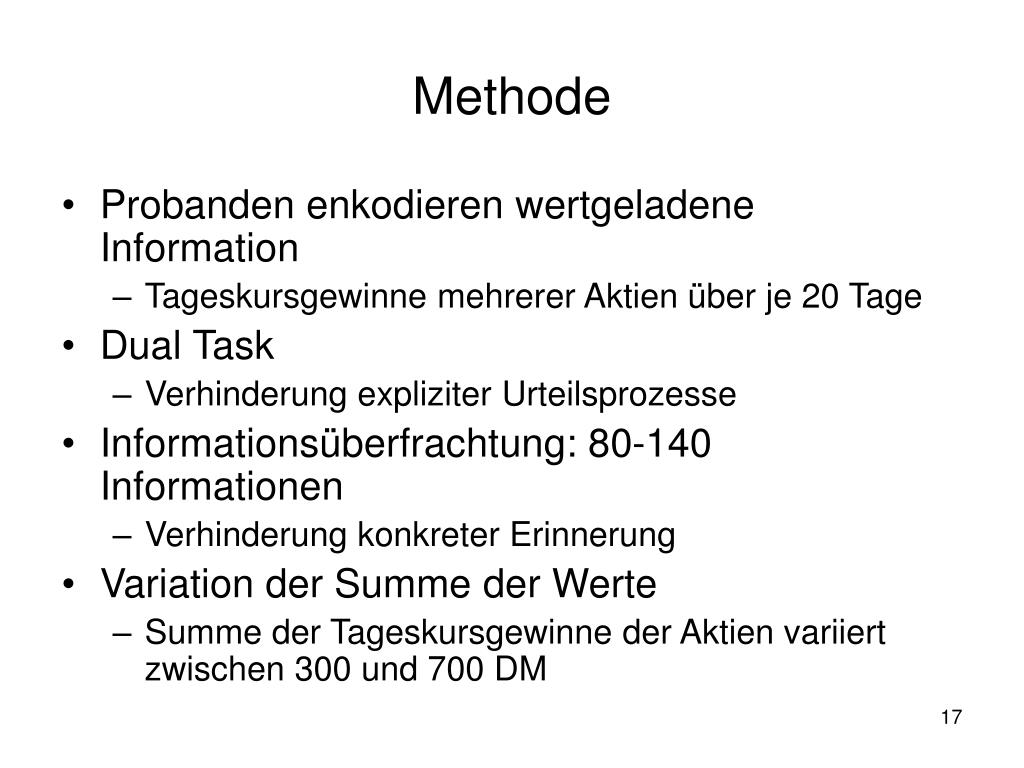 Methode • Probanden enkodieren wertgeladene Information • Tageskursgewinne mehrerer Aktien über je 20 Tage • Dual Task • Verhinderung expliziter Urteilsprozesse • Informationsüberfrachtung: 80-140 Informationen • Verhinderung konkreter Erinnerung • Variation der Summe der Werte • Summe der Tageskursgewinne der Aktien variiert zwischen 300 und 700 DM
