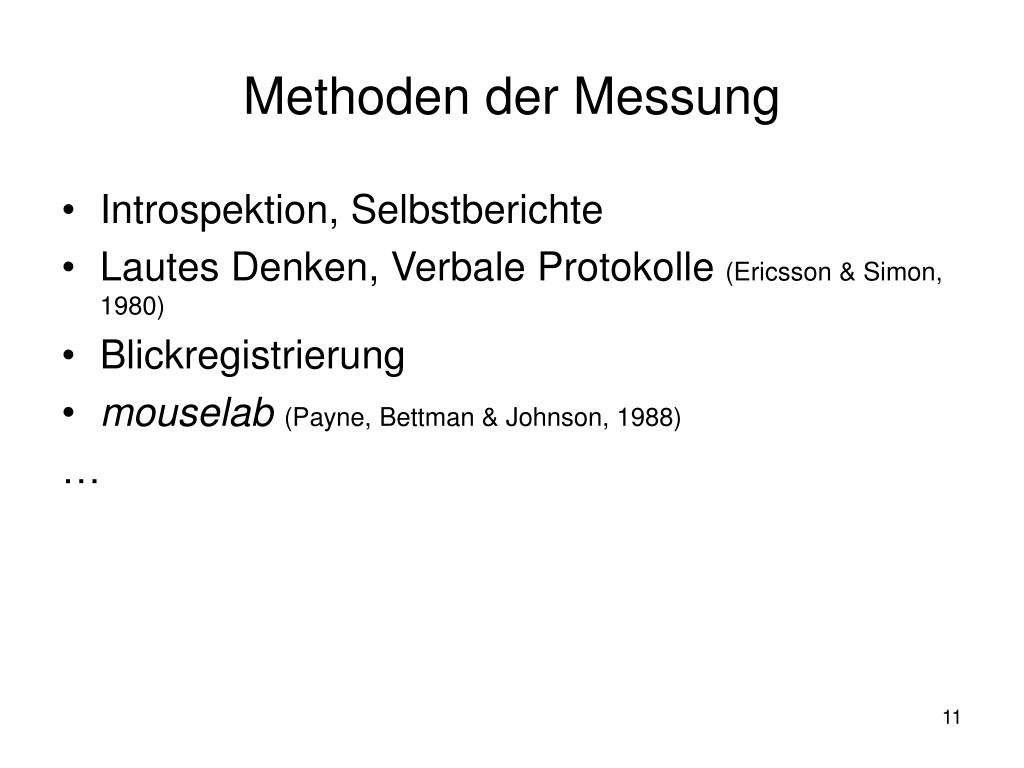 Methoden der Messung • Introspektion, Selbstberichte • Lautes Denken, Verbale Protokolle (Ericsson & Simon, 1980) • Blickregistrierung • mouselab(Payne, Bettman & Johnson, 1988) …