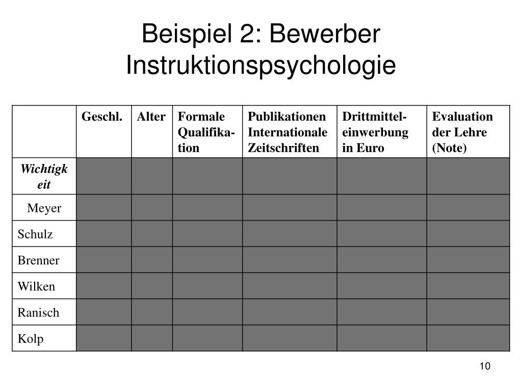 Equal Weight Rule (EWR) • Einhorn & Hogarth (1975); Thorngate (1980) • Kompensatorisch • Hier werden die Gewichte ignoriert oder als Konstante angenommen. • Summation der Werte für jede Option.