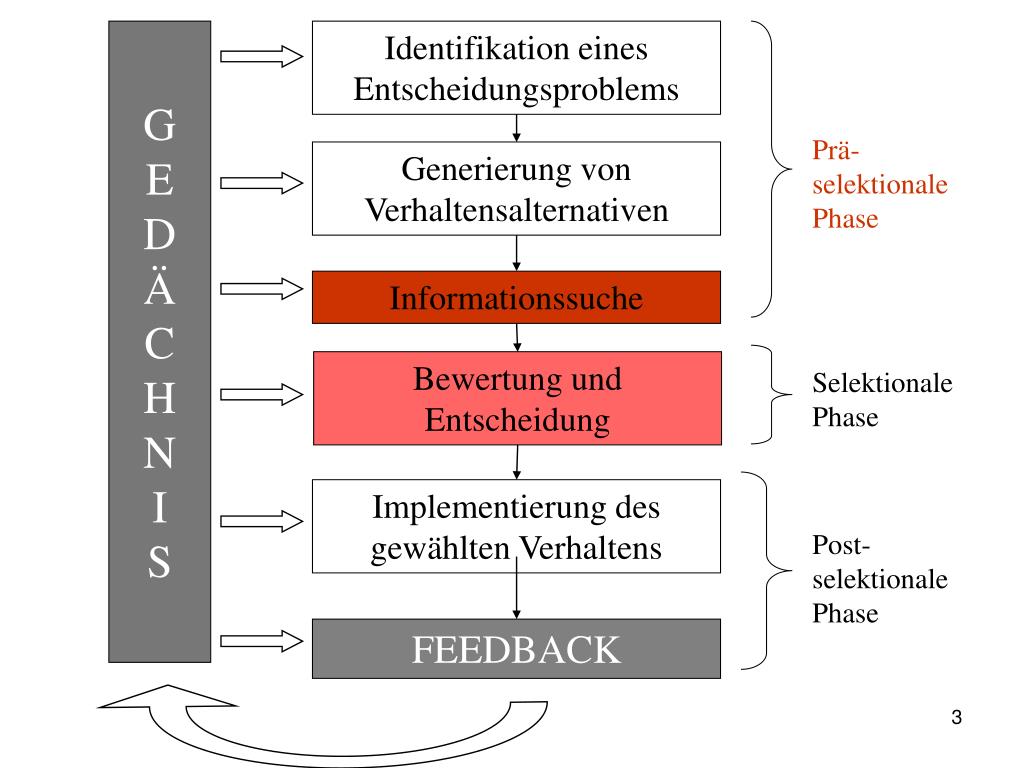 G E D Ä C H N I S Identifikation eines Entscheidungsproblems Prä-selektionale Phase Generierung von Verhaltensalternativen Informationssuche Bewertung und Entscheidung Selektionale Phase Implementierung des gewählten Verhaltens Post-selektionale Phase FEEDBACK