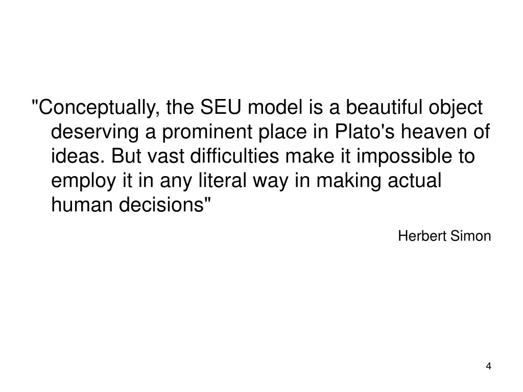 "Conceptually, the SEU model is a beautiful object deserving a prominent place in Plato's heaven of ideas. But vast difficulties make it impossible to employ it in any literal way in making actual human decisions" Herbert Simon