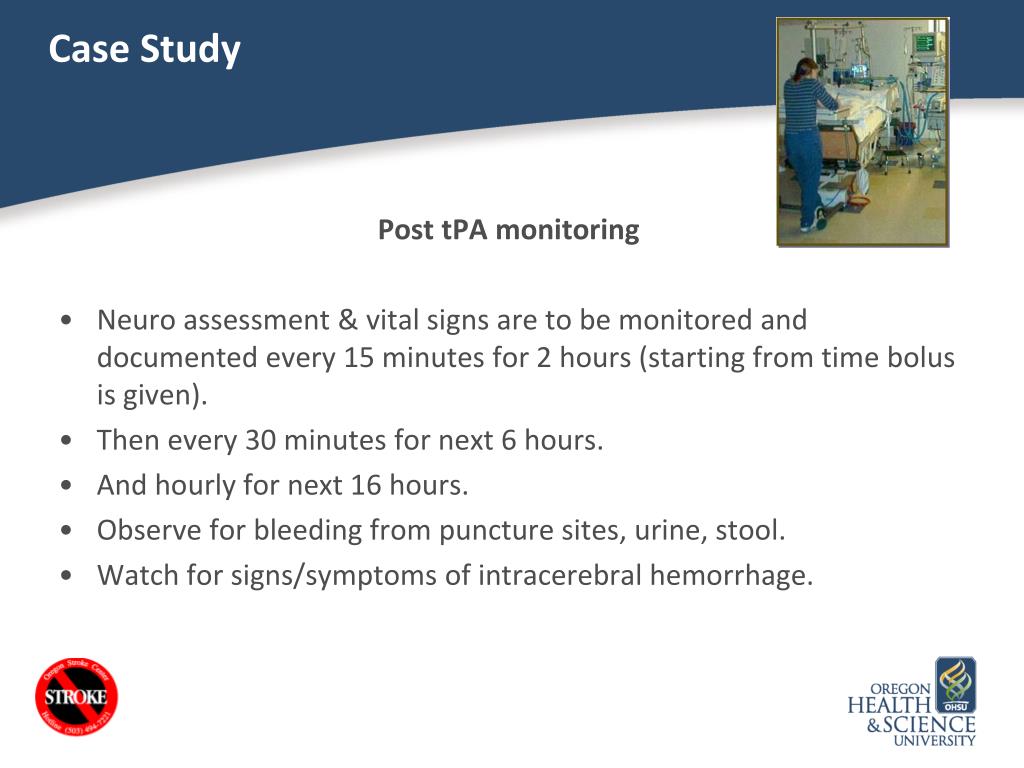 Case Study Post tPA monitoring • Neuro assessment & vital signs are to be monitored and documented every 15 minutes for 2 hours (starting from time bolus is given). • Then every 30 minutes for next 6 hours. • And hourly for next 16 hours. • Observe for bleeding from puncture sites, urine, stool. • Watch for signs/symptoms of intracerebral hemorrhage.