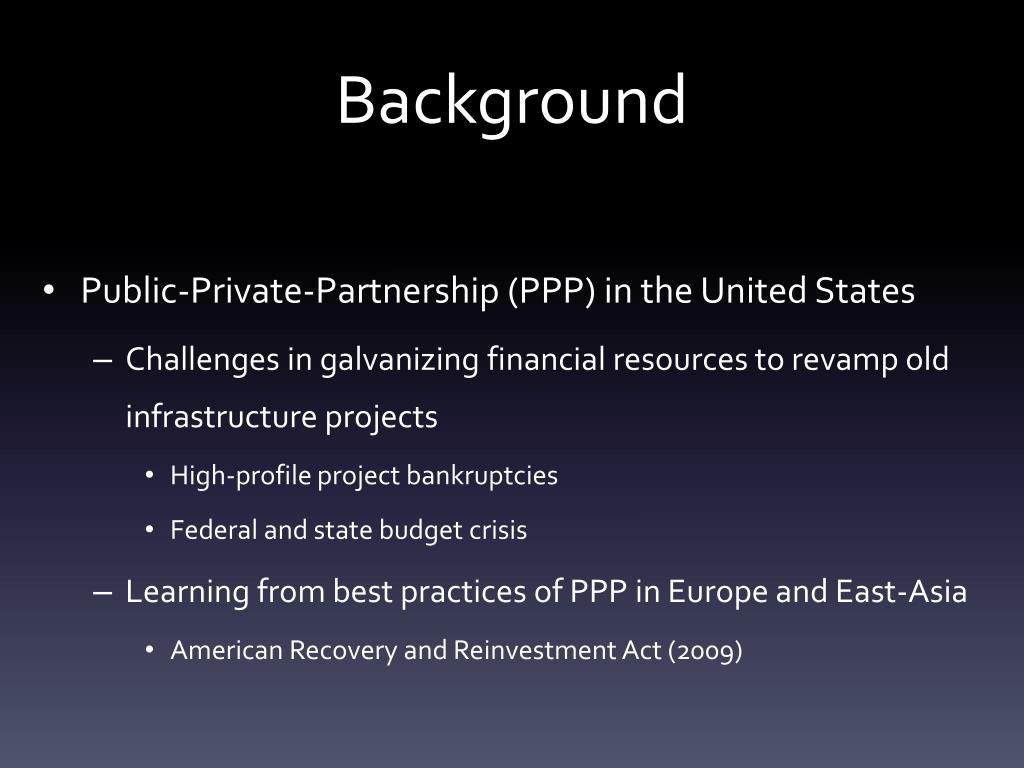 Background • Public-Private-Partnership (PPP) in the United States • Challenges in galvanizing financial resources to revamp old infrastructure projects • High-profile project bankruptcies • Federal and state budget crisis • Learning from best practices of PPP in Europe and East-Asia • American Recovery and Reinvestment Act (2009)