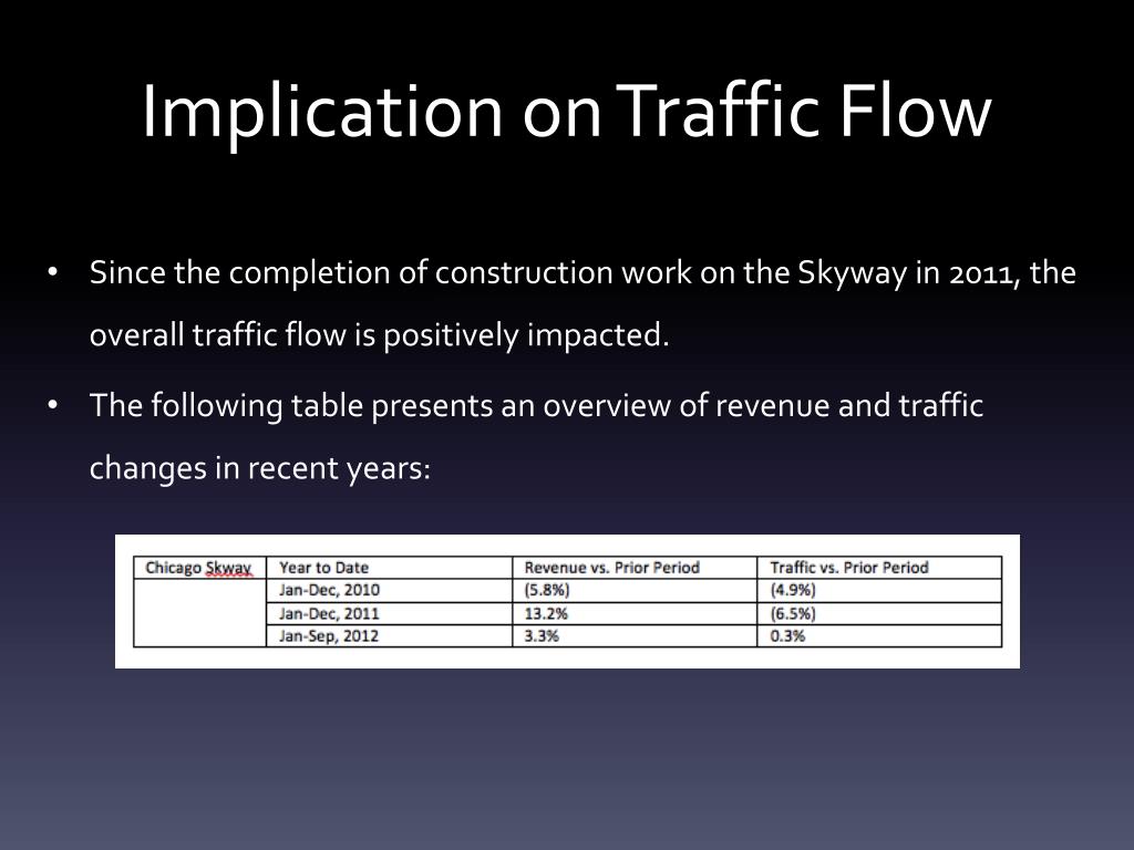 Implication • Major potential downside is that the city government does not specify any basis for intervention in the concessionaire’s rights to set tolls. • The Skyway is the only toll highway that is not operated by Illinois Toll Highway Authority. • From 2004 to 2017, rates can still go up 2.5 fold for cars and 3.5 fold for commercial vehicles. • By 2017, the compound average annual toll rate increase will be 7.3% over 13 years and 10.1% per year since 2005. • The price for peak times can be 40% greater than maximum rates allowed as long as the price during off-peak times is discounted.