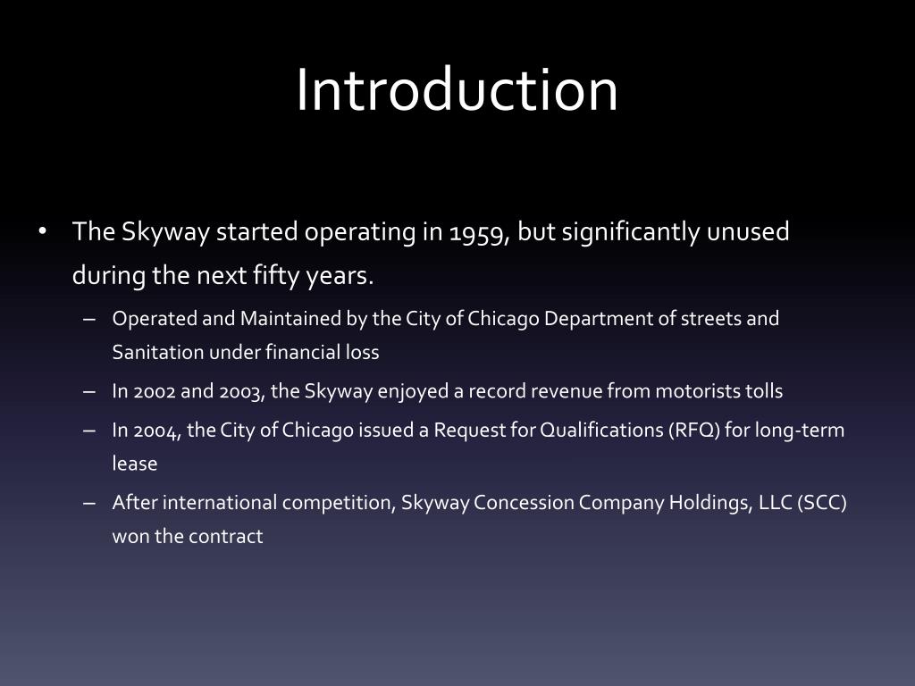 Introduction • The Skyway started operating in 1959, but significantly unused during the next fifty years. • Operated and Maintained by the City of Chicago Department of streets and Sanitation under financial loss • In 2002 and 2003, the Skyway enjoyed a record revenue from motorists tolls • In 2004, the City of Chicago issued a Request for Qualifications (RFQ) for long-term lease • After international competition, Skyway Concession Company Holdings, LLC (SCC) won the contract