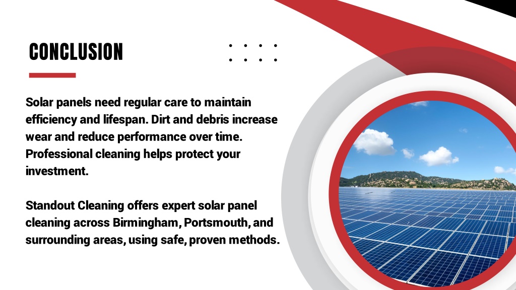 CONCLUSION • Solar panels need regular care to maintain efficiency and lifespan. Dirt and debris increase wear and reduce performance over time. Professional cleaning helps protect your investment. • Standout Cleaning offers expert solar panel cleaning across Birmingham, Portsmouth, and surrounding areas, using safe, proven methods.
