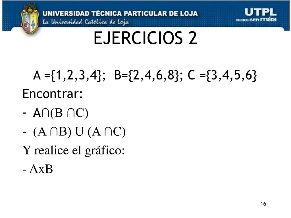 EJERCICIOS 2 A ={1,2,3,4};B={2,4,6,8}; C ={3,4,5,6} Encontrar: A∩(B ∩C) (A ∩B) U (A ∩C) Y realice el gráfico: - AxB