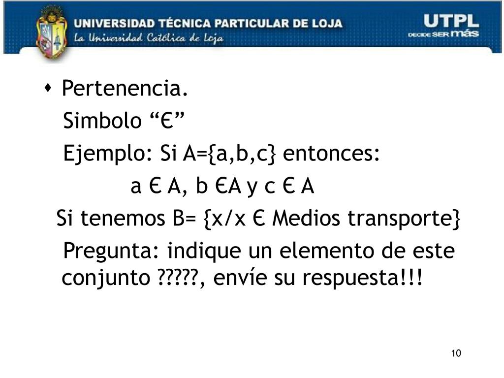 Pertenencia. Simbolo “Є” Ejemplo: Si A={a,b,c} entonces: a Є A, b ЄA y c Є A Si tenemos B= {x/x Є Medios transporte} Pregunta: indique un elemento de este conjunto ?????, envíe su respuesta!!!