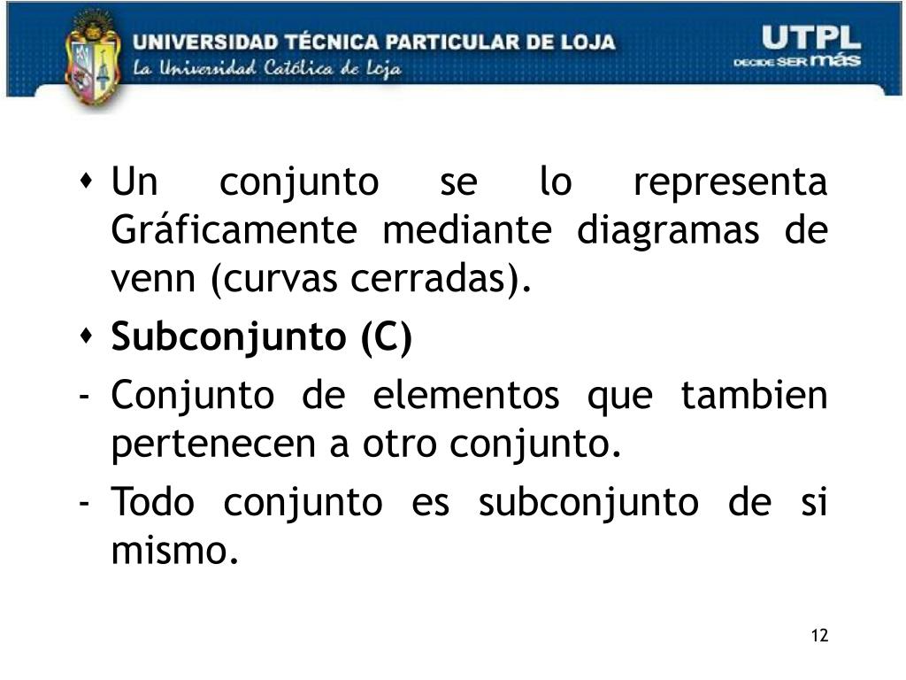 Un conjunto se lo representa Gráficamente mediante diagramas de venn (curvas cerradas). Subconjunto (С) Conjunto de elementos que tambien pertenecen a otro conjunto. Todo conjunto es subconjunto de si mismo.