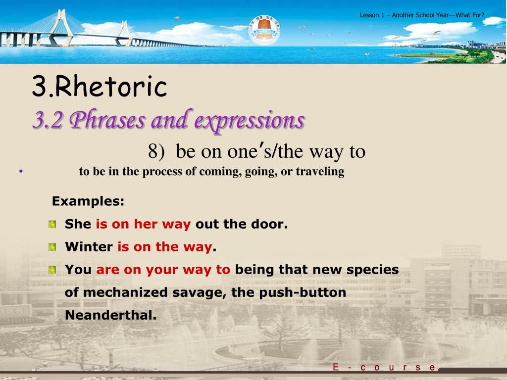 Lesson 1 – Another School Year---What For? 3.Rhetoric 3.2 Phrases and expressions 8) be on one’s/the way to • tobein the process of coming, going, or traveling • Examples: • She ison her way out the door. • Winter ison the way. • You areon your way to being that new species • of mechanized savage, the push-button • Neanderthal.