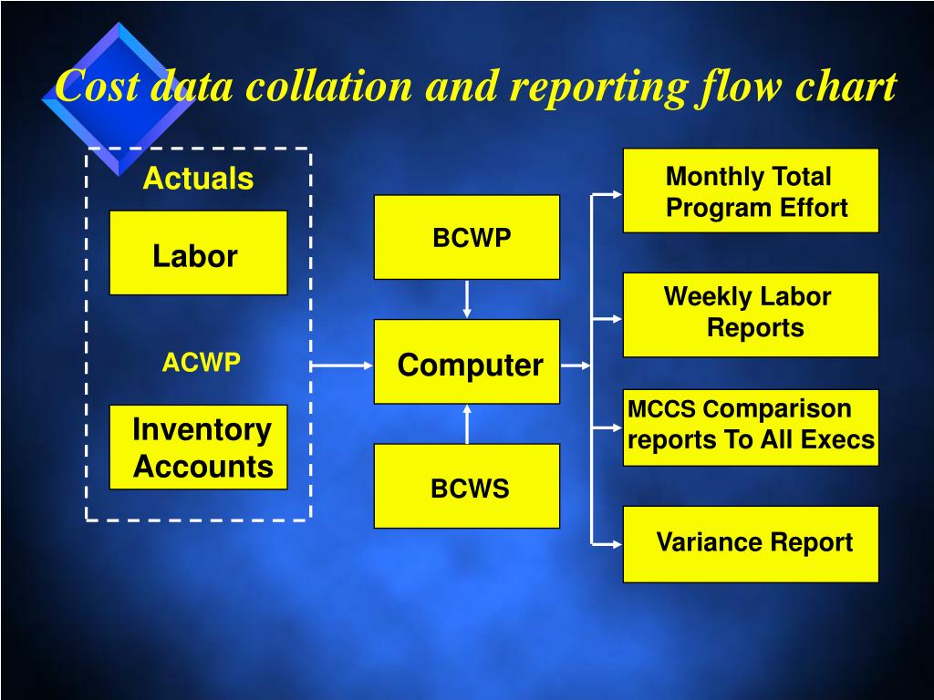 Cost data collation and reporting flow chart Actuals Monthly Total Program Effort BCWP Labor Weekly Labor Reports Computer ACWP MCCS Comparison reports To All Execs Inventory Accounts BCWS Variance Report