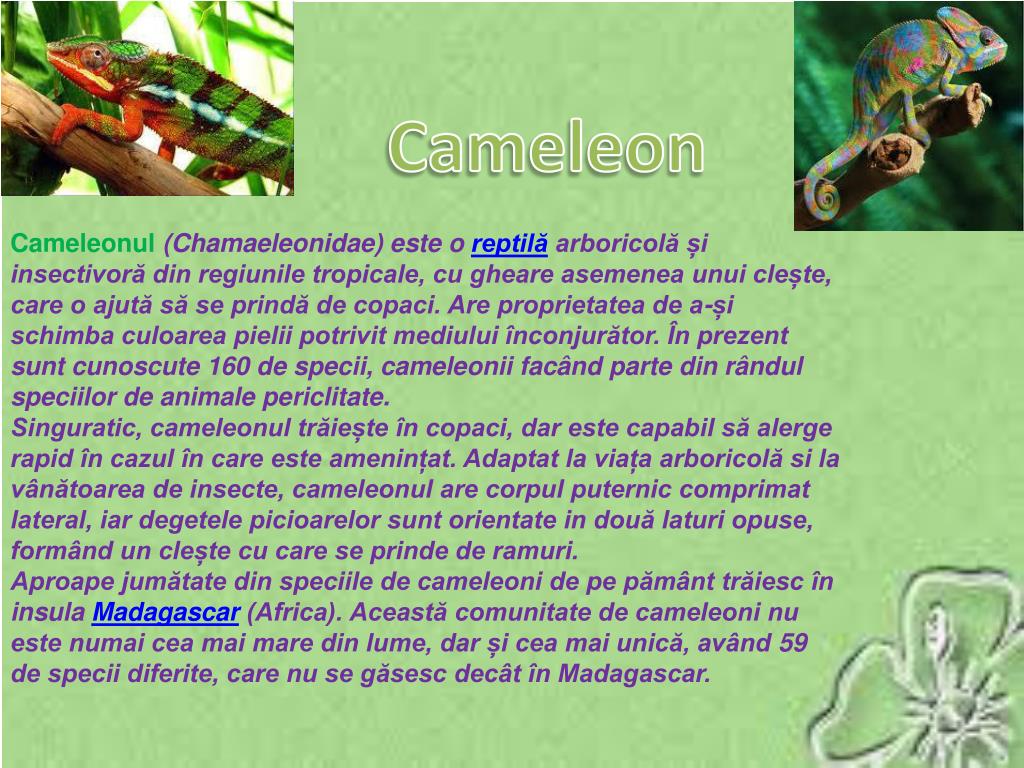 Cameleon Cameleonul(Chamaeleonidae) este o reptilă arboricolă și insectivoră din regiunile tropicale, cu gheare asemenea unui clește, care o ajută să se prindă de copaci. Are proprietatea de a-și schimba culoarea pielii potrivit mediului înconjurător. În prezent sunt cunoscute 160 de specii, cameleonii facând parte din rândul speciilor de animale periclitate. Singuratic, cameleonul trăiește în copaci, dar este capabil să alerge rapid în cazul în care este amenințat. Adaptat la viața arboricolă si la vânătoarea de insecte, cameleonul are corpul puternic comprimat lateral, iar degetele picioarelor sunt orientate in două laturi opuse, formând un clește cu care se prinde de ramuri. Aproape jumătate din speciile de cameleoni de pe pământ trăiesc în insula Madagascar (Africa). Această comunitate de cameleoni nu este numai cea mai mare din lume, dar și cea mai unică, având 59 de specii diferite, care nu se găsesc decât în Madagascar.