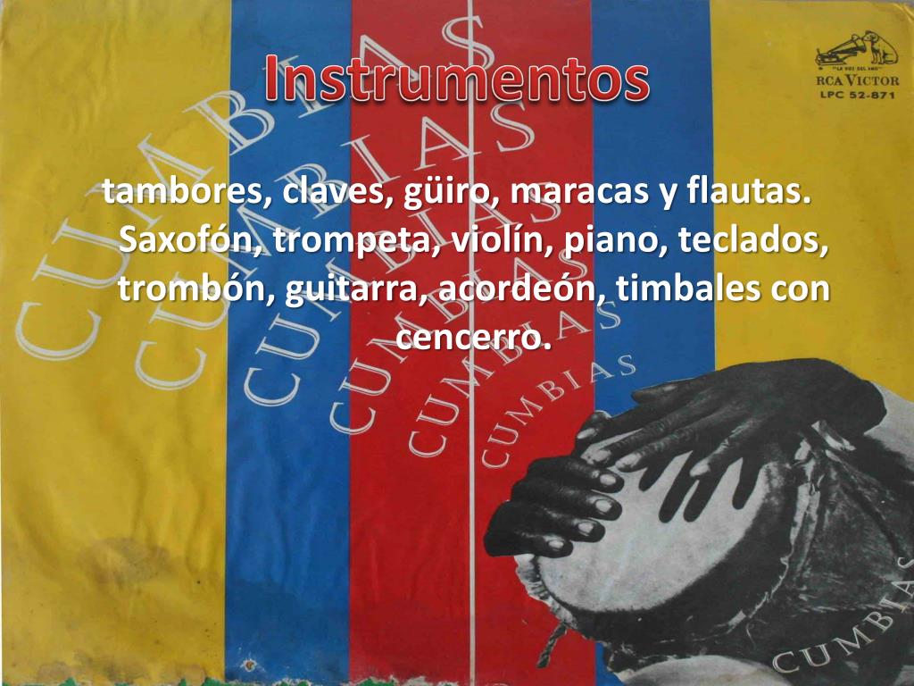 By: John And Jennifer Dunn. Instrumentos. tambores , claves, güiro , maracas y flautas . Saxofón , trompeta , violín , piano, teclados , trombón , guitarra , acordeón , timbales con cencerro . Cumbia. Cumbia viene del pais de Colombia. Bailar cumbia representa Colombia. .