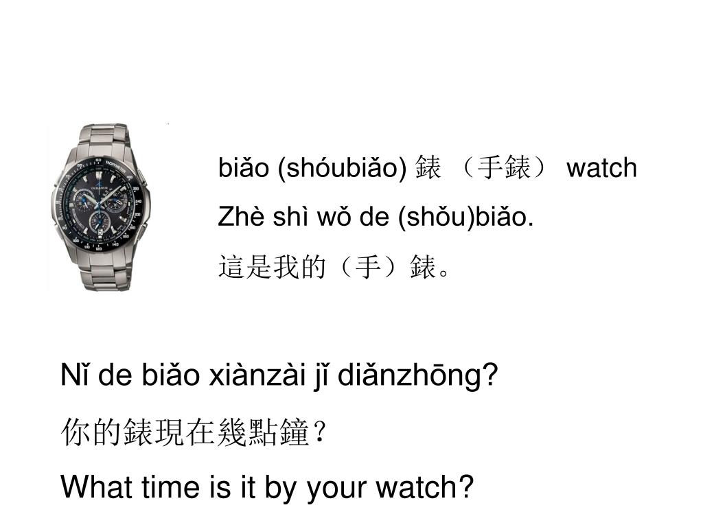 biǎo (shóubiǎo) 錶 (手錶) watch Zhè shì wǒ de (shǒu)biǎo. 這是我的(手)錶。 Nǐ de biǎo xiànzài jǐ diǎnzhōng? 你的錶現在幾點鐘? What time is it by your watch?