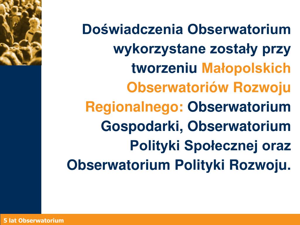 Doświadczenia Obserwatorium wykorzystane zostały przy tworzeniu Małopolskich Obserwatoriów Rozwoju Regionalnego: Obserwatorium Gospodarki, Obserwatorium Polityki Społecznej oraz Obserwatorium Polityki Rozwoju.