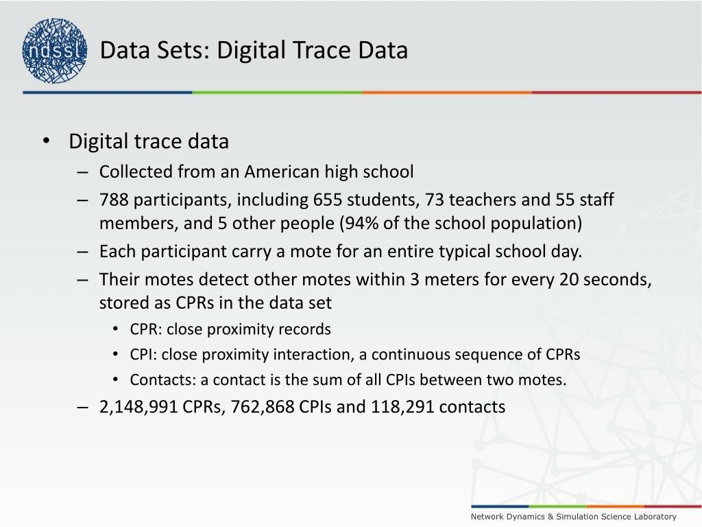 Data Sets: Digital Trace Data • Digital trace data • Collected from an American high school • 788 participants, including 655 students, 73 teachers and 55 staff members, and 5 other people (94% of the school population) • Each participant carry a mote for an entire typical school day. • Their motes detect other motes within 3 meters for every 20 seconds, stored as CPRs in the data set • CPR: close proximity records • CPI: close proximity interaction, a continuous sequence of CPRs • Contacts: a contact is the sum of all CPIs between two motes. • 2,148,991 CPRs, 762,868 CPIs and 118,291 contacts
