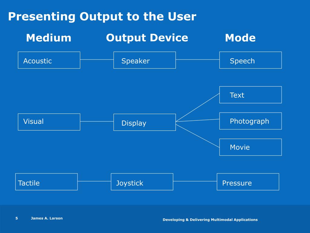 Presenting Output to the User Multimedia Output Device Medium Mode Acoustic Speaker Speech Text Photograph Visual Display Movie Tactile Joystick Pressure Developing & Delivering Multimodal Applications