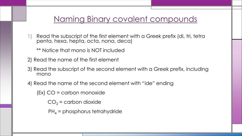 Naming Binary covalent compounds Read the subscript of the first element with a Greek prefix (di, tri, tetra penta, hexa, hepta, octa, nona, deca) ** Notice that mono is NOT included 2) Read the name of the first element 3) Read the subscript of the second element with a Greek prefix, including mono 4) Read the name of the second element with “ide” ending (Ex) CO = carbon monoxide CO2 = carbon dioxide PH4 = phosphorus tetrahydride