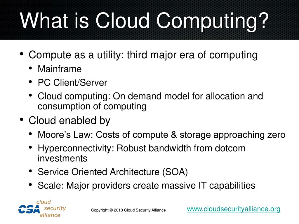 Cloud Security: Critical Threats and Global Initiatives. Jim Reavis, Executive Director July, 2010. What is Cloud Computing?. Compute as a utility: third major era of computing Mainframe PC Client/Server Cloud computing: On demand model for allocation and consumption of computing
