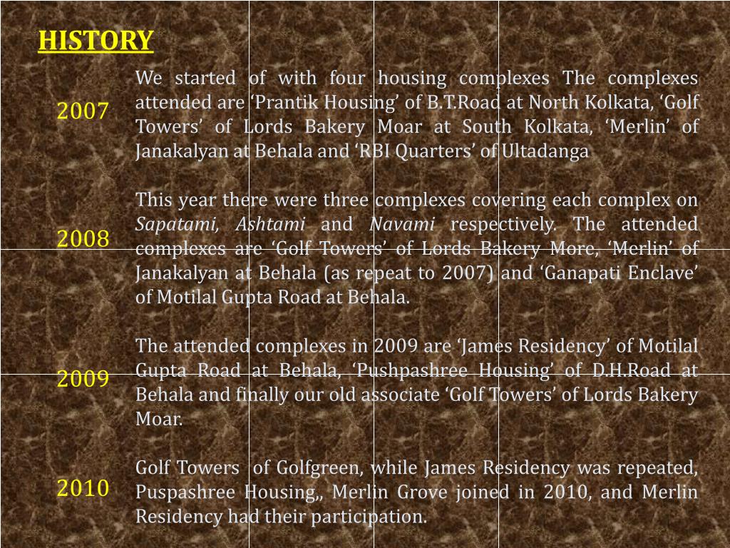 HISTORY We started of with four housing complexes The complexes attended are ‘Prantik Housing’ of B.T.Road at North Kolkata, ‘Golf Towers’ of Lords Bakery Moar at South Kolkata, ‘Merlin’ of Janakalyan at Behala and ‘RBI Quarters’ of Ultadanga This year there were three complexes covering each complex on Sapatami, AshtamiandNavamirespectively. The attended complexes are ‘Golf Towers’ of Lords Bakery More, ‘Merlin’ of Janakalyan at Behala (as repeat to 2007) and ‘Ganapati Enclave’ of Motilal Gupta Road at Behala. The attended complexes in 2009 are ‘James Residency’ of Motilal Gupta Road at Behala, ‘Pushpashree Housing’ of D.H.Road at Behala and finally our old associate ‘Golf Towers’ of Lords Bakery Moar. Golf Towers of Golfgreen, while James Residency was repeated, Puspashree Housing,, Merlin Grove joined in 2010, and Merlin Residency had their participation. 2007 2008 2009 2010