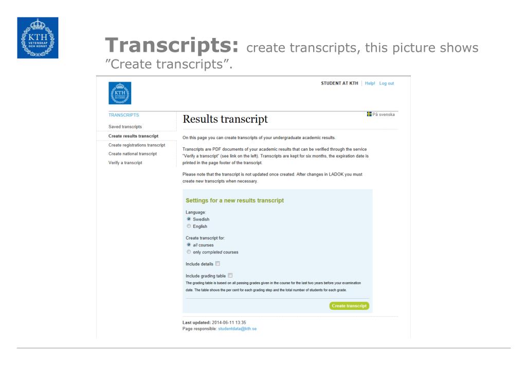 Ladokon the Web services for students-to be found in the personal menu on www.kth.se Somescreenshots June 2014, VoS