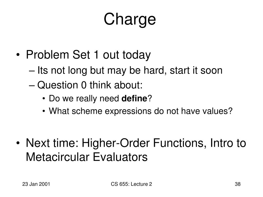 Charge • Problem Set 1 out today • Its not long but may be hard, start it soon • Question 0 think about: • Do we really need define? • What scheme expressions do not have values? • Next time: Higher-Order Functions, Intro to Metacircular Evaluators CS 655: Lecture 2