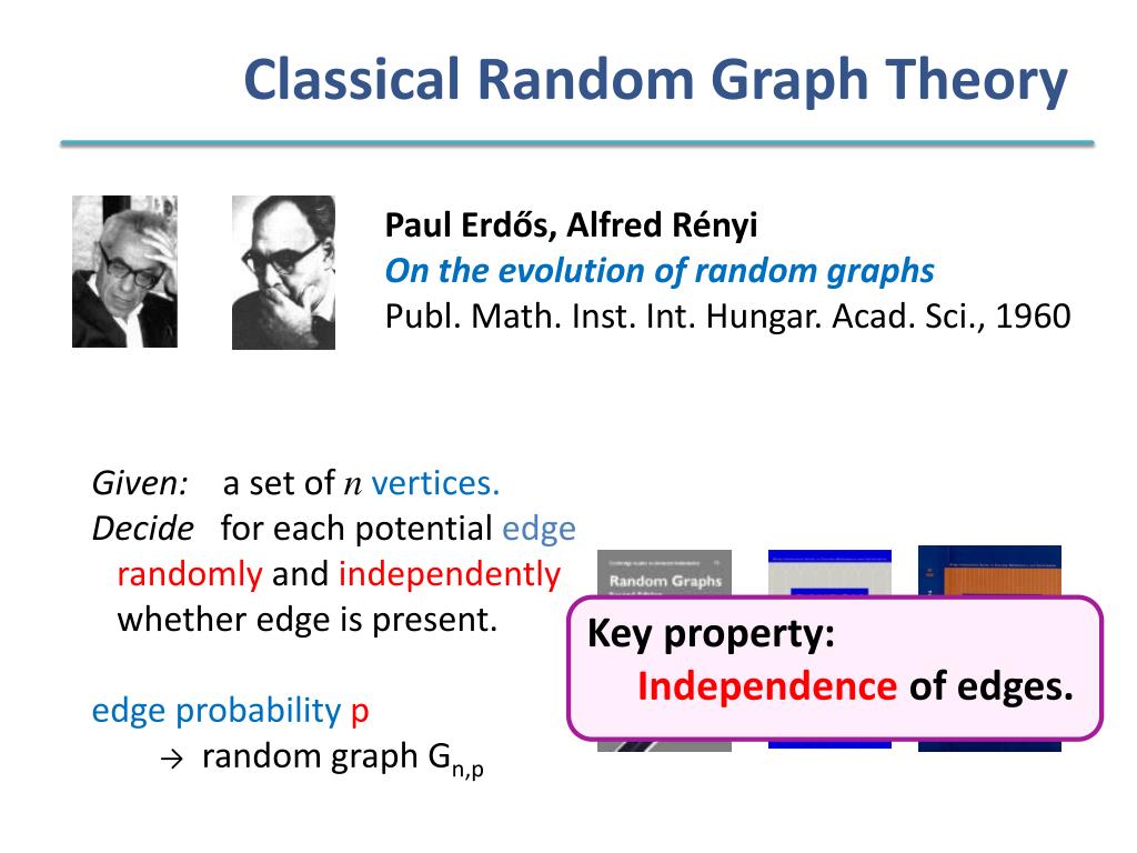 Classical Random Graph Theory Paul Erdős, Alfred Rényi On the evolution of random graphs Publ. Math. Inst. Int. Hungar. Acad. Sci., 1960 Given: a set of nvertices. Decideforeach potential edge randomly and independently whetheredgeispresent. edgeprobabilityp →randomgraphGn,p Key property: Independenceofedges.