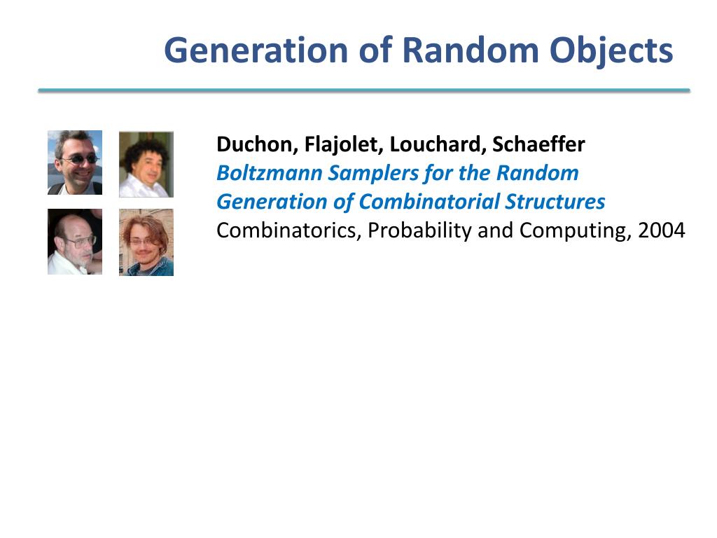Generation of RandomObjects Duchon, Flajolet, Louchard, Schaeffer Boltzmann Samplers for the Random Generation of Combinatorial Structures Combinatorics, Probability and Computing, 2004