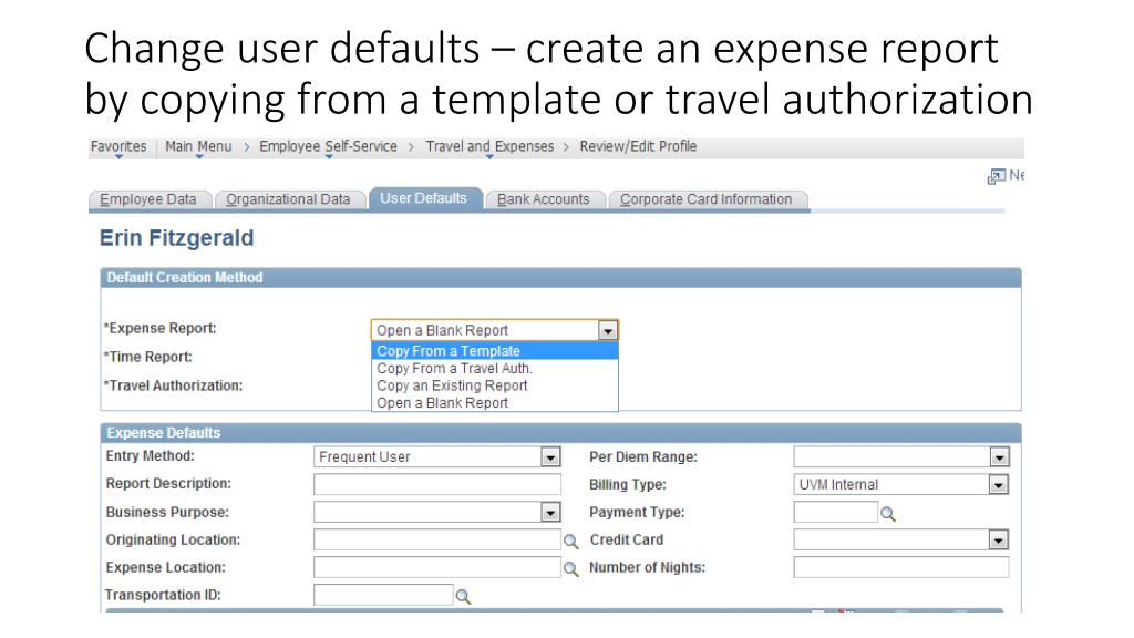 Change user defaults – create an expense report by copying from a template or travel authorization