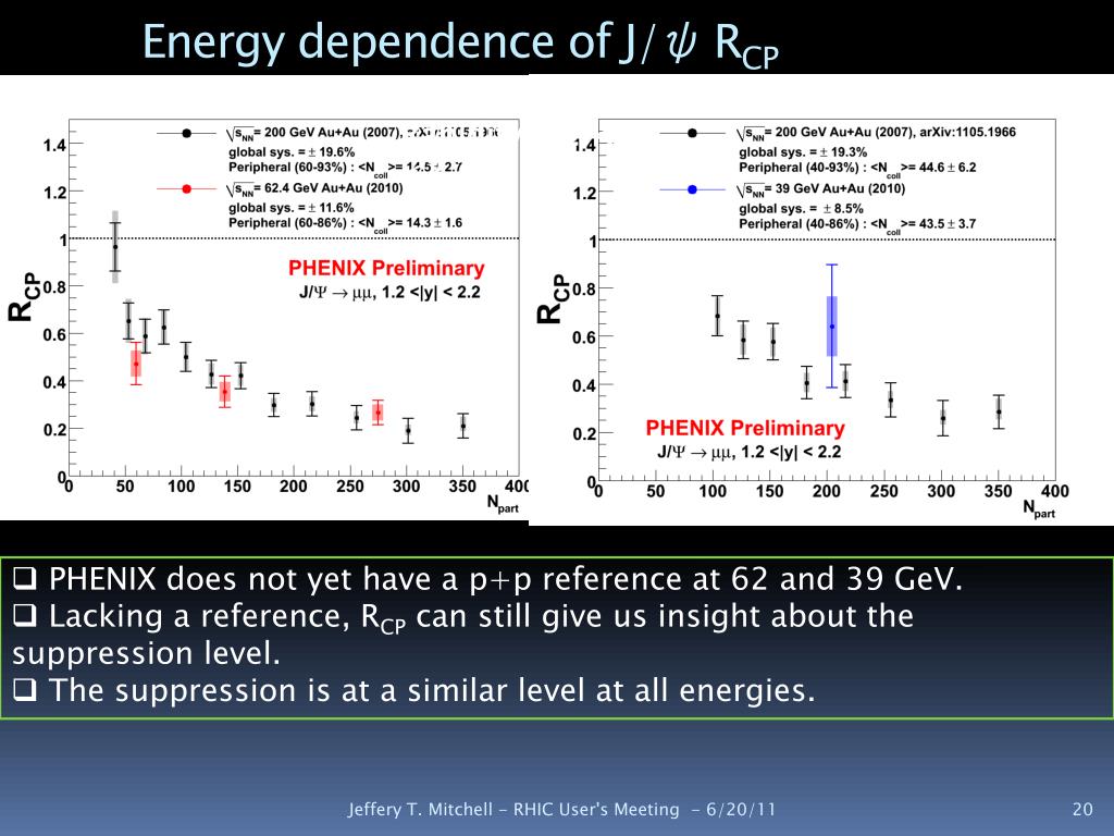 Energy dependence of J/ψRCP Rapidity 1.2 <|y| <2.2 • PHENIX does not yet have a p+p reference at 62 and 39 GeV. • Lacking a reference, RCP can still give us insight about the suppression level. • The suppression is at a similar level at all energies. Jeffery T. Mitchell - RHIC User's Meeting - 6/20/11 20