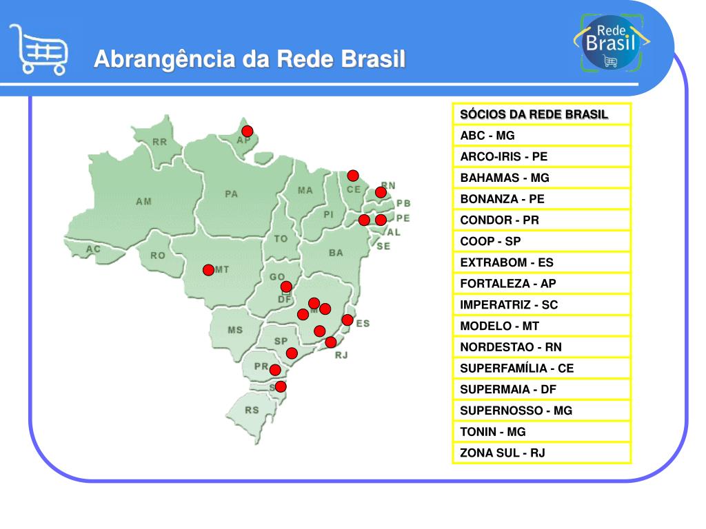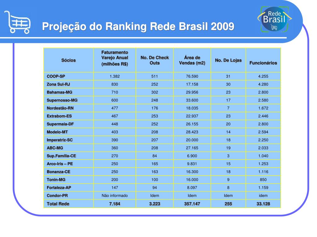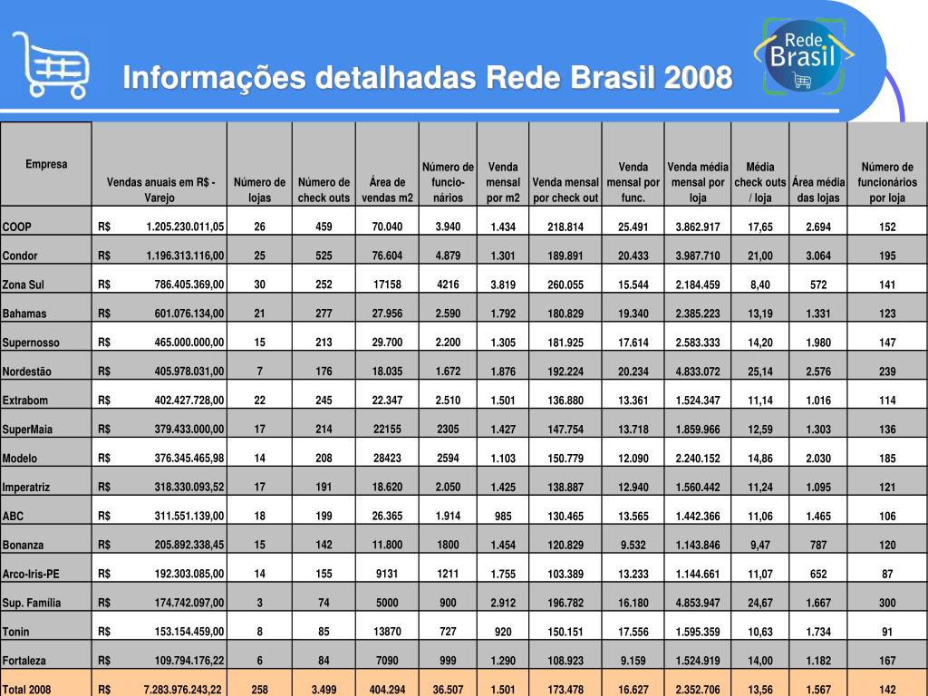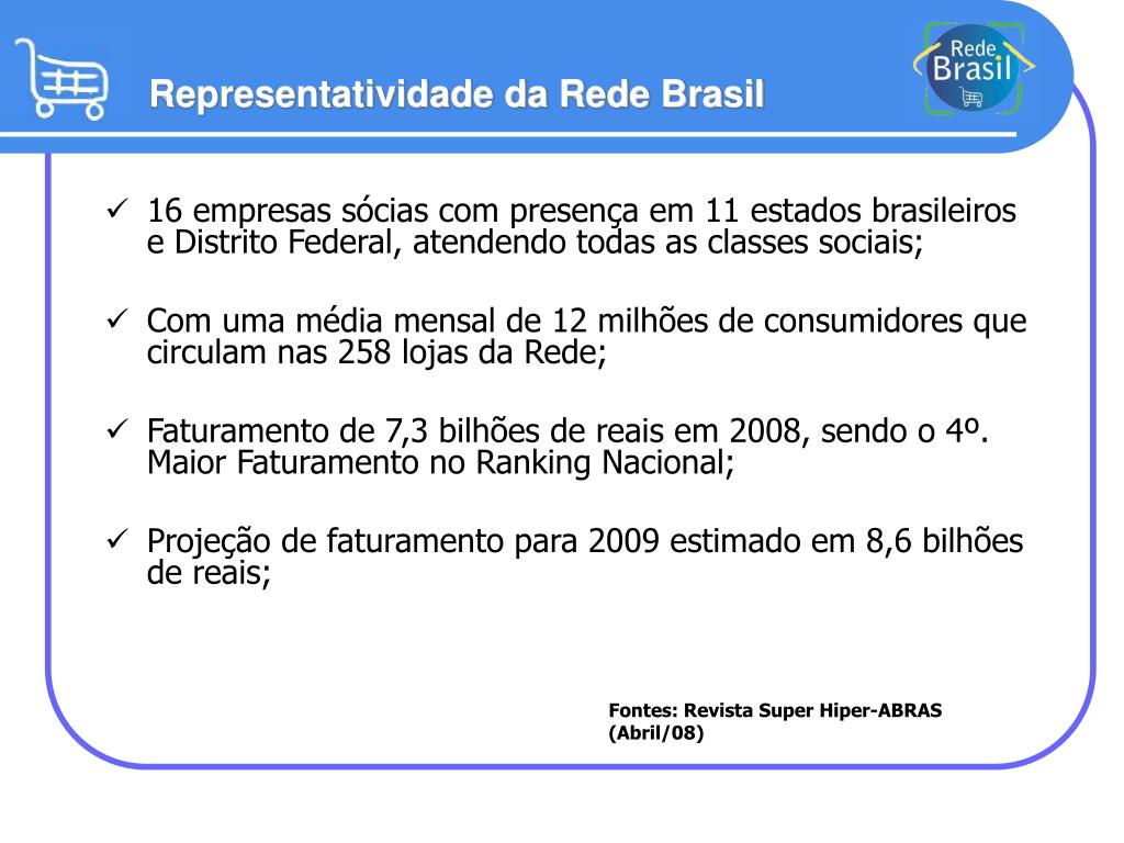 Representatividade da Rede Brasil • 16 empresas sócias com presença em 11 estados brasileiros e Distrito Federal, atendendo todas as classes sociais; • Com uma média mensal de 12 milhões de consumidores que circulam nas 258 lojas da Rede; • Faturamento de 7,3 bilhões de reais em 2008, sendo o 4º. Maior Faturamento no Ranking Nacional; • Projeção de faturamento para 2009 estimado em 8,6 bilhões de reais; Fontes: Revista Super Hiper-ABRAS (Abril/08)