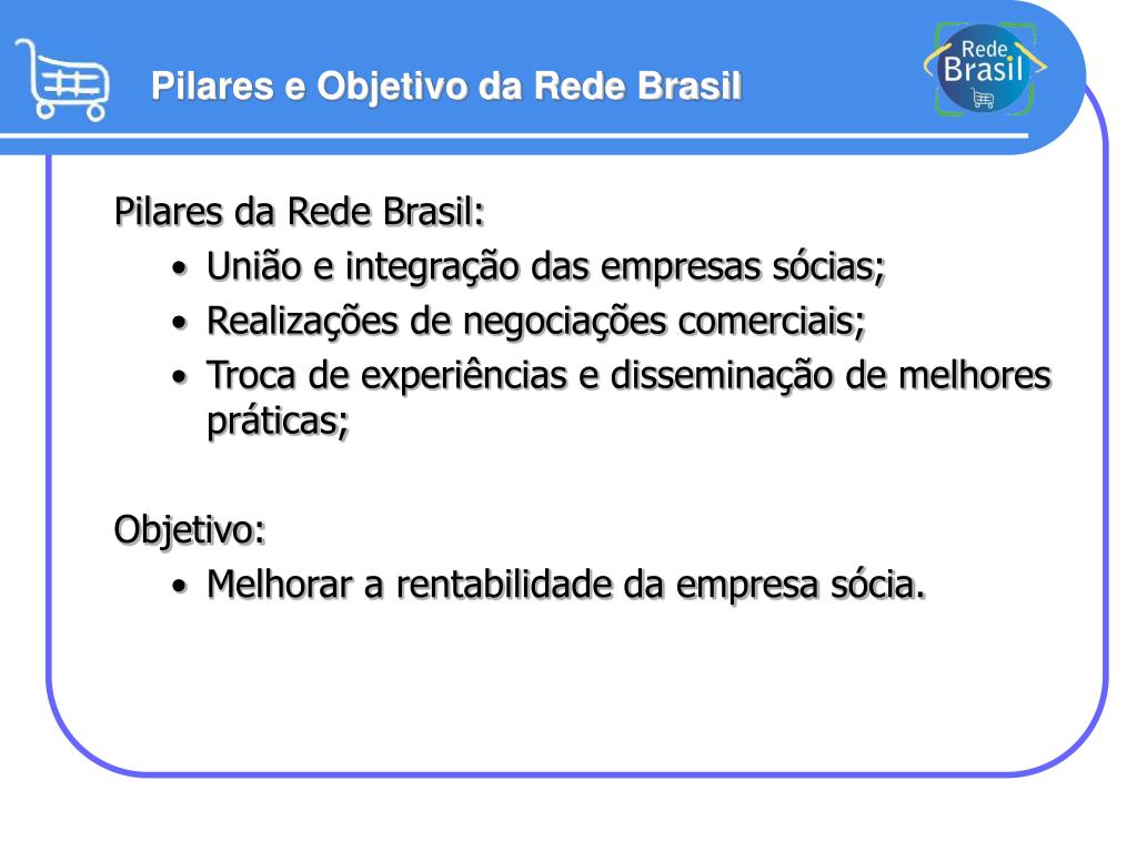 Pilares e Objetivo da Rede Brasil Pilares da Rede Brasil: • União e integração das empresas sócias; • Realizações de negociações comerciais; • Troca de experiências e disseminação de melhores práticas; Objetivo: • Melhorar a rentabilidade da empresa sócia.