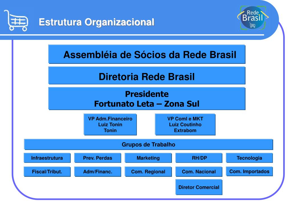 Estrutura Organizacional Assembléia de Sócios da Rede Brasil Diretoria Rede Brasil Presidente Fortunato Leta – Zona Sul VP Adm.Financeiro Luiz Tonin Tonin VP Coml e MKT Luiz Coutinho Extrabom Grupos de Trabalho Infraestrutura Prev. Perdas Marketing RH/DP Tecnologia Fiscal/Tribut. Adm/Financ. Com. Regional Com. Nacional Com. Importados Diretor Comercial
