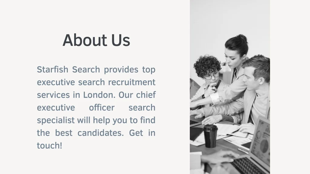 About Us • Starfish Search provides top executive search recruitment services in London. Our chief executive officer search specialist will help you to find the best candidates. Get in touch!