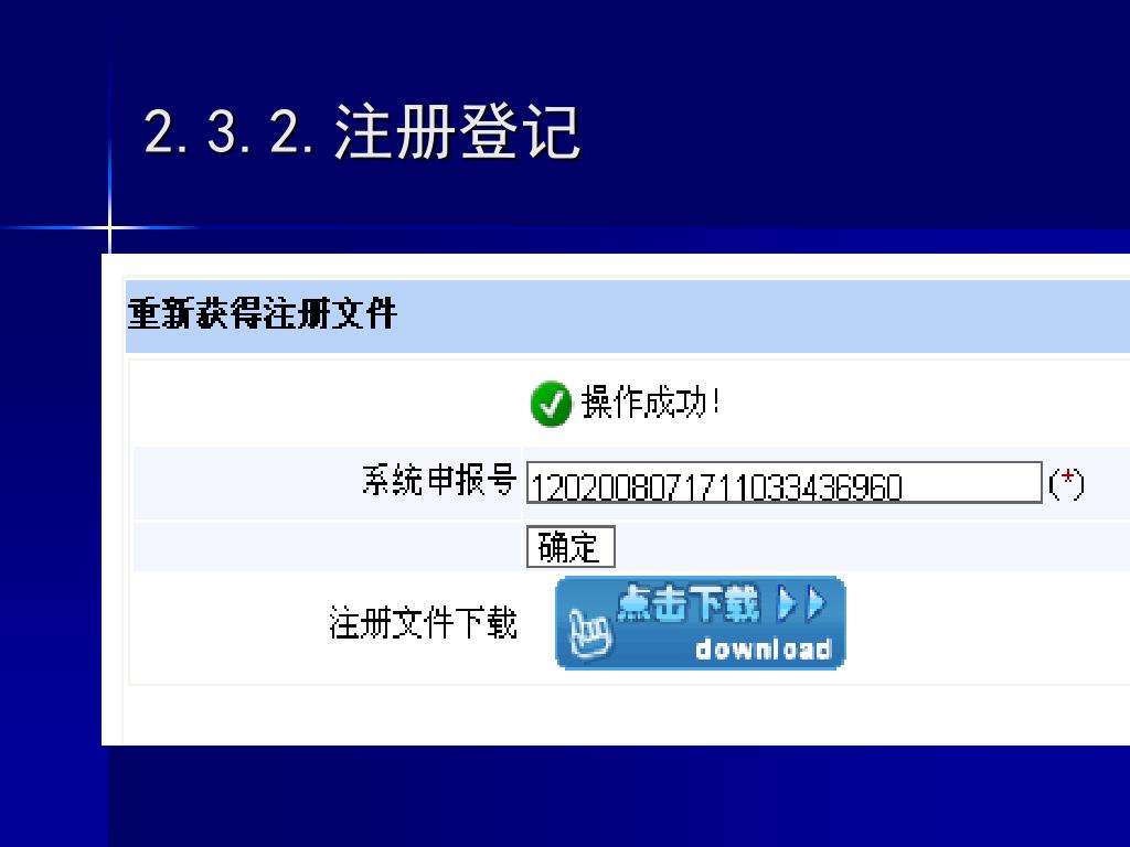 2.3.2.注册登记 企业登录“高新技术企业认定管理工作网”,按要求填写注册登记表,并通过网络系统上传至认定机构。 认定机构应及时完成企业身份确认并将用户名和密码告知企业。 准备好: • 组织机构代码证:一个组织机构代码证只能注册一次; • 税务登记证 • 确保邮箱畅通