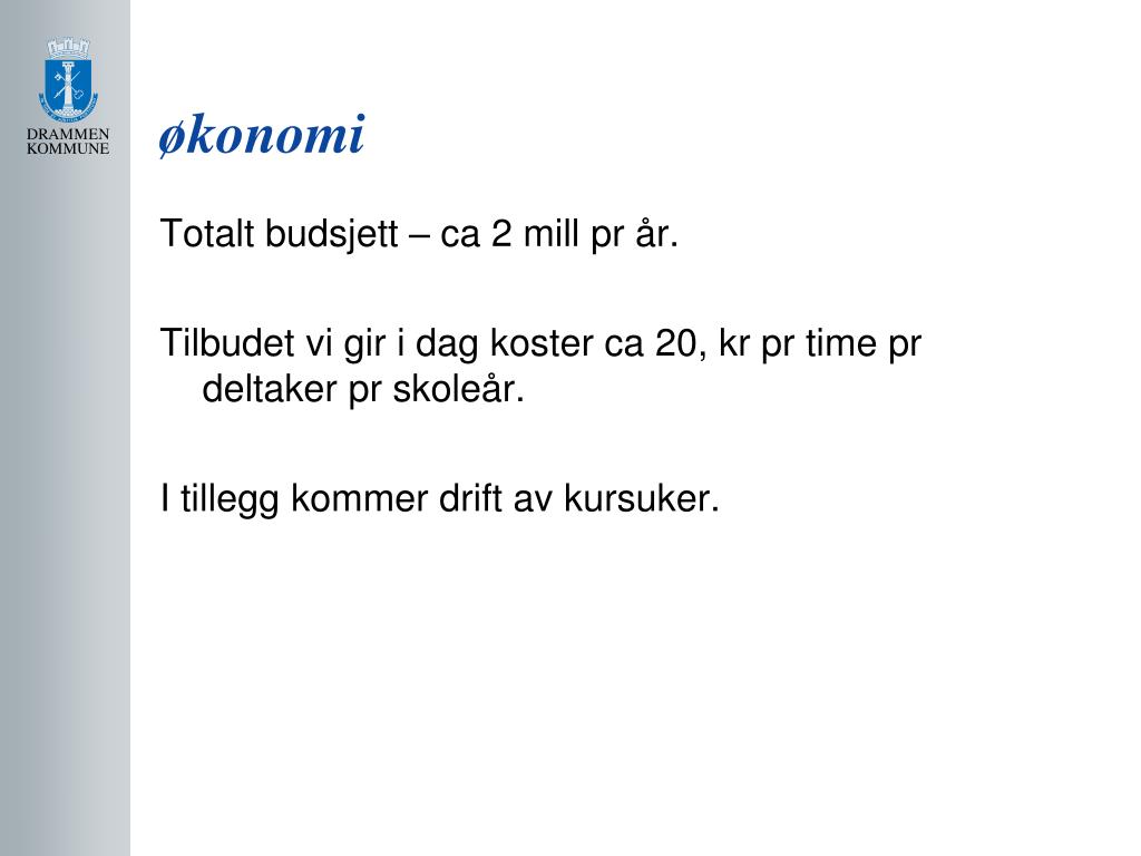 økonomi • Totalt budsjett – ca 2 mill pr år. • Tilbudet vi gir i dag koster ca 20, kr pr time pr deltaker pr skoleår. • I tillegg kommer drift av kursuker.