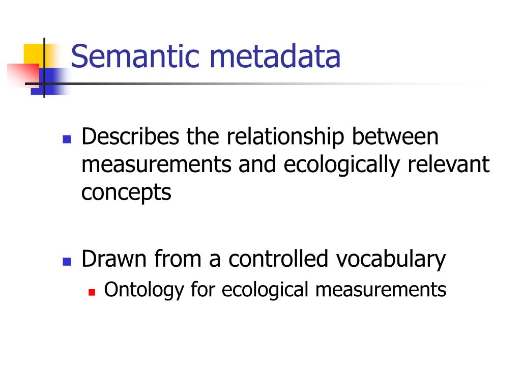 Semantic metadata • Describes the relationship between measurements and ecologically relevant concepts • Drawn from a controlled vocabulary • Ontology for ecological measurements