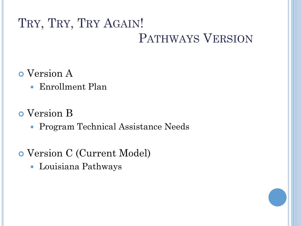 Try, Try, Try Again! Pathways Version • Version A • Enrollment Plan • Version B • Program Technical Assistance Needs • Version C (Current Model) • Louisiana Pathways