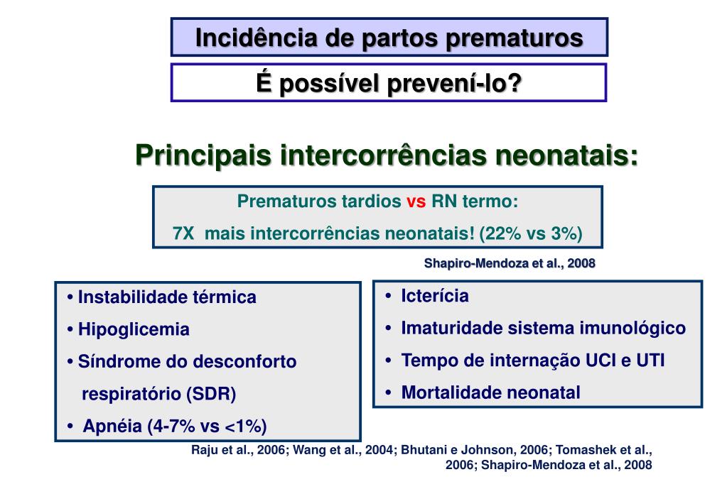 Incidência de partos prematuros É possívelprevení-lo? Principais intercorrências tardias: • Reinternações hospitalares (infecções e icterícia) *(sem outras comorbidades: 4,3% vs 2,7% RN de termo) • Problemas comportamentais (8 anos): 20% (> que nos de termo) • Óbito infantil súbito • Mortalidade infantil: 7,7 por 1000 (vs 2,5 por 1000: nascidos a termo) Rajuet al., 2006; Wanget al., 2004; Bhutani e Johnson, 2006; Tomasheket al., 2006; Shapiro-Mendozaet al., 2006; Gray etal, 2004; ACOG, 2008 AAP, 2004