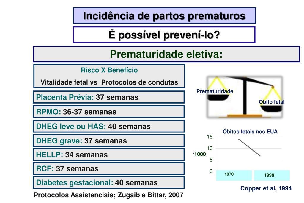 Incidência de partos prematuros É possívelprevení-lo? Prematuridade eletiva: Risco X Benefício Vitalidade fetal vs Protocolos de condutas Prematuridade Placenta Prévia: 37 semanas Óbito fetal RPMO: 36-37 semanas DHEG leve ou HAS: 40 semanas Óbitos fetais nos EUA DHEG grave: 37 semanas HELLP: 34 semanas /1000 RCF: 37 semanas 1998 Diabetes gestacional: 40 semanas Copper et al, 1994 Protocolos Assistenciais; Zugaib e Bittar, 2007