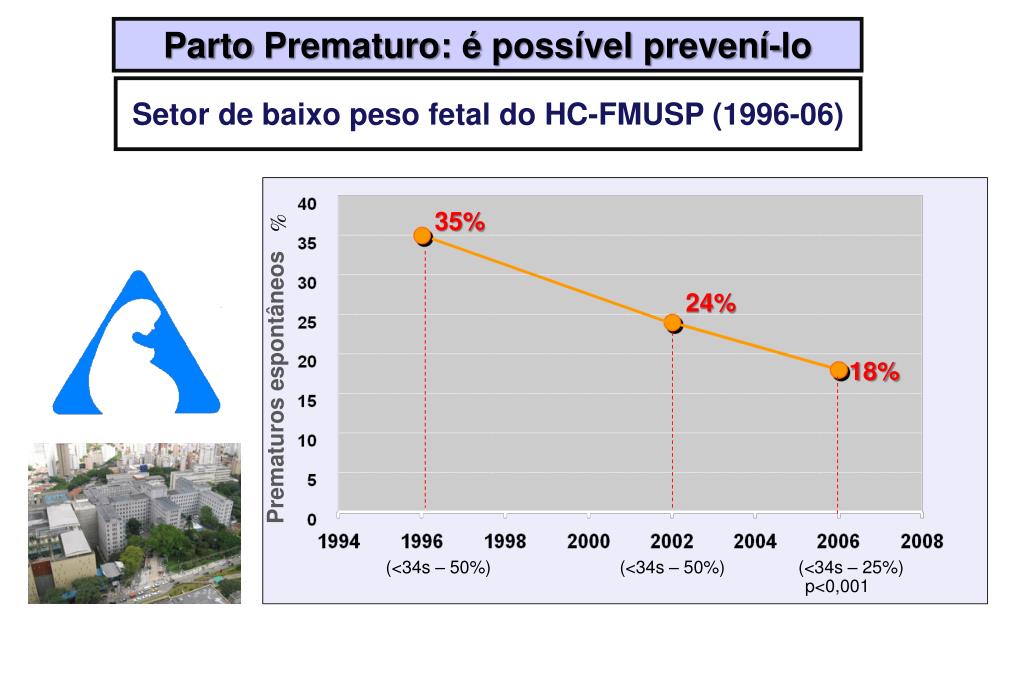 PartoPrematuro: é possívelprevení-lo Setor de baixo peso fetal do HC-FMUSP (1996-06) 35% % 24% Prematurosespontâneos 18% (<34s – 50%) (<34s – 50%) (<34s – 25%) p<0,001