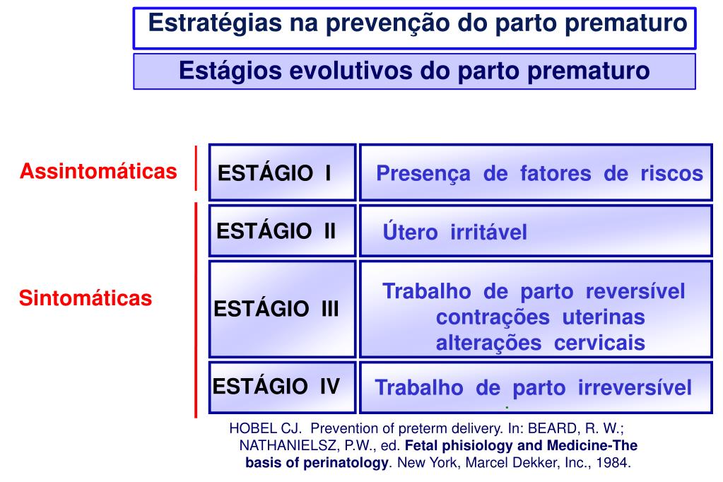 Estratégias na prevenção do parto prematuro Estágios evolutivos do parto prematuro Útero irritável Trabalho de parto reversível contrações uterinas alterações cervicais Trabalho de parto irreversível Assintomáticas ESTÁGIO I Presença de fatores de riscos ESTÁGIO II Sintomáticas ESTÁGIO III ESTÁGIO IV HOBEL CJ. Prevention of preterm delivery. In:BEARD, R. W.; NATHANIELSZ, P.W., ed. Fetal phisiology and Medicine-The basis of perinatology. New York, Marcel Dekker, Inc., 1984.