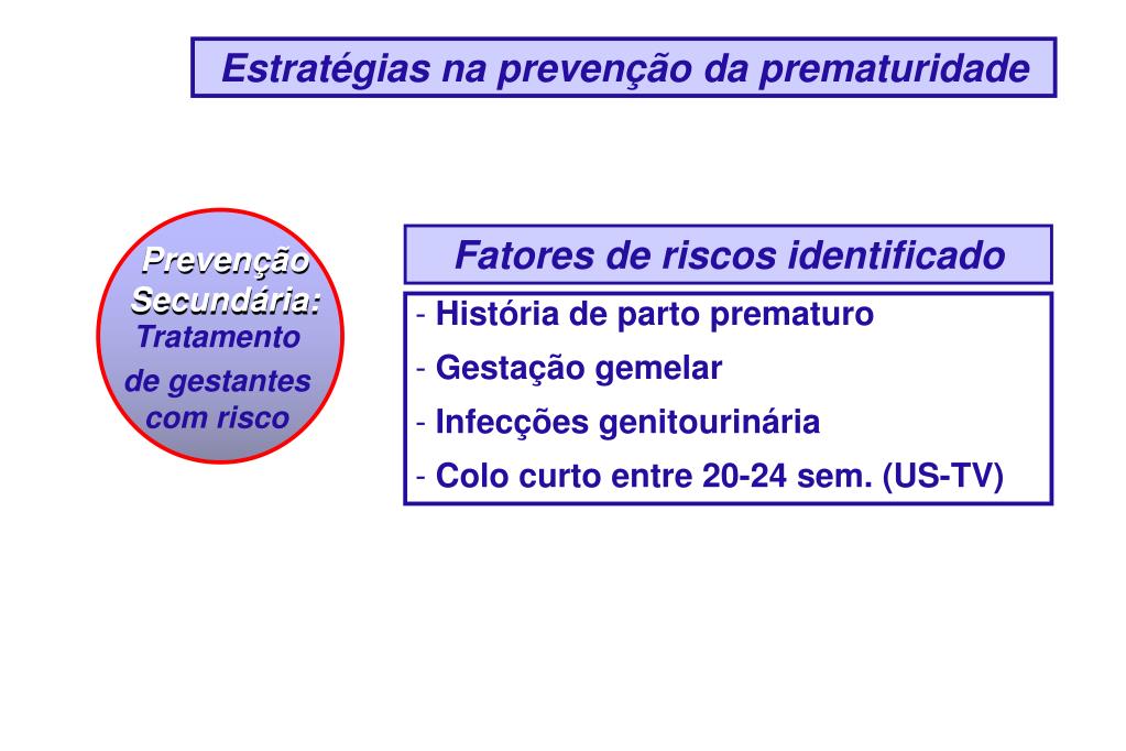Estratégias na prevenção da prematuridade Fatores de riscos identificado Prevenção Secundária: • História de parto prematuro • Gestação gemelar • Infecções genitourinária • Colo curto entre 20-24 sem. (US-TV) Tratamento de gestantes com risco