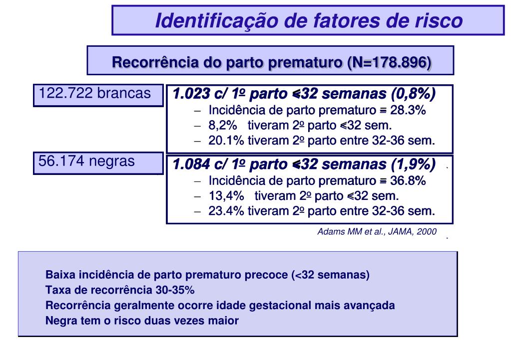 122.722 brancas . 56.174 negras . Identificação de fatores de risco Recorrência do parto prematuro (N=178.896) 1.023 c/ 1oparto <32 semanas (0,8%) • Incidência de partoprematuro = 28.3% • 8,2% tiveram 2oparto <32 sem. • 20.1% tiveram 2oparto entre 32-36 sem. . Baixa incidência de parto prematuro precoce (<32 semanas) Taxa de recorrência 30-35% Recorrência geralmente ocorre idade gestacional mais avançada Negra tem o risco duas vezes maior 1.084 c/ 1o parto <32 semanas (1,9%) • Incidência de parto prematuro = 36.8% • 13,4% tiveram 2o parto <32 sem. • 23.4% tiveram 2o parto entre 32-36 sem. . Adams MM et al., JAMA, 2000