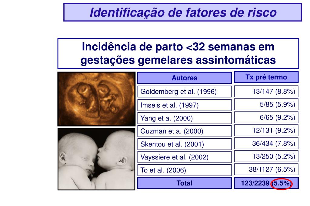 Identificação de fatores de risco Incidência de parto <32 semanas em gestações gemelares assintomáticas Tx pré termo Autores 13/147 (8.8%) Goldemberg et al. (1996) 5/85 (5.9%) Imseis et al. (1997) 6/65 (9.2%) Yang et a. (2000) 12/131 (9.2%) Guzman et a. (2000) 36/434 (7.8%) Skentou et al. (2001) 13/250 (5.2%) Vayssiere et al. (2002) 38/1127 (6.5%) To et al. (2006) Total 123/2239 (5.5%)