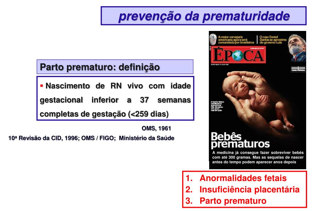 prevençãodaprematuridade Partoprematuro: definição • Nascimento de RN vivo com idadegestacional inferior a 37 semanascompletas de gestação (<259 dias) A medicinajáconseguefazersobreviverbebês com até 300 gramas. Mas as sequelas de nascer antes do tempo podemapareceranosdepois OMS, 1961 10a Revisão da CID, 1996; OMS / FIGO; Ministério da Saúde Anormalidadesfetais Insuficiênciaplacentária Partoprematuro