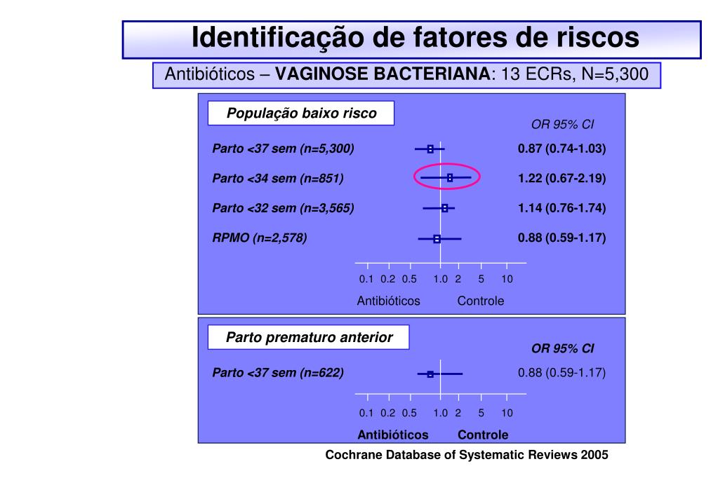 População baixo risco OR 95% CI 0.87 (0.74-1.03) 1.22 (0.67-2.19) 1.14 (0.76-1.74) 0.88 (0.59-1.17) Parto <37 sem (n=5,300) Parto <34 sem (n=851) Parto <32 sem (n=3,565) RPMO (n=2,578) 0.1 0.2 0.5 1.0 2 5 10 Antibióticos Controle Parto prematuro anterior OR 95% CI 0.88 (0.59-1.17) Parto <37 sem (n=622) 0.1 0.2 0.5 1.0 2 5 10 Antibióticos Controle Identificação de fatores de riscos Antibióticos – VAGINOSE BACTERIANA: 13 ECRs, N=5,300 Cochrane Database of Systematic Reviews 2005
